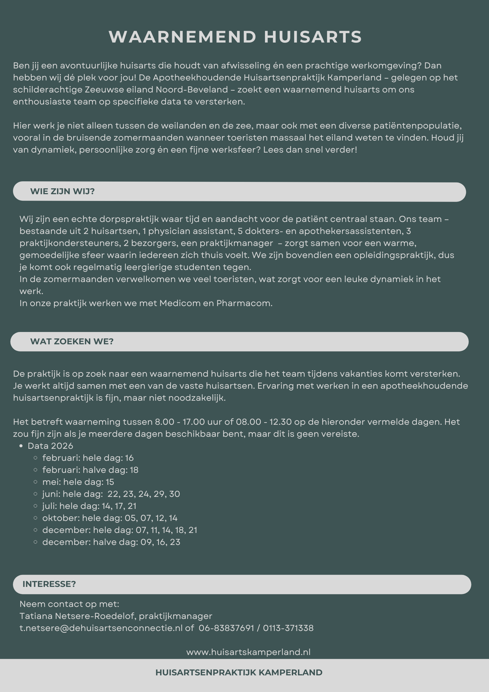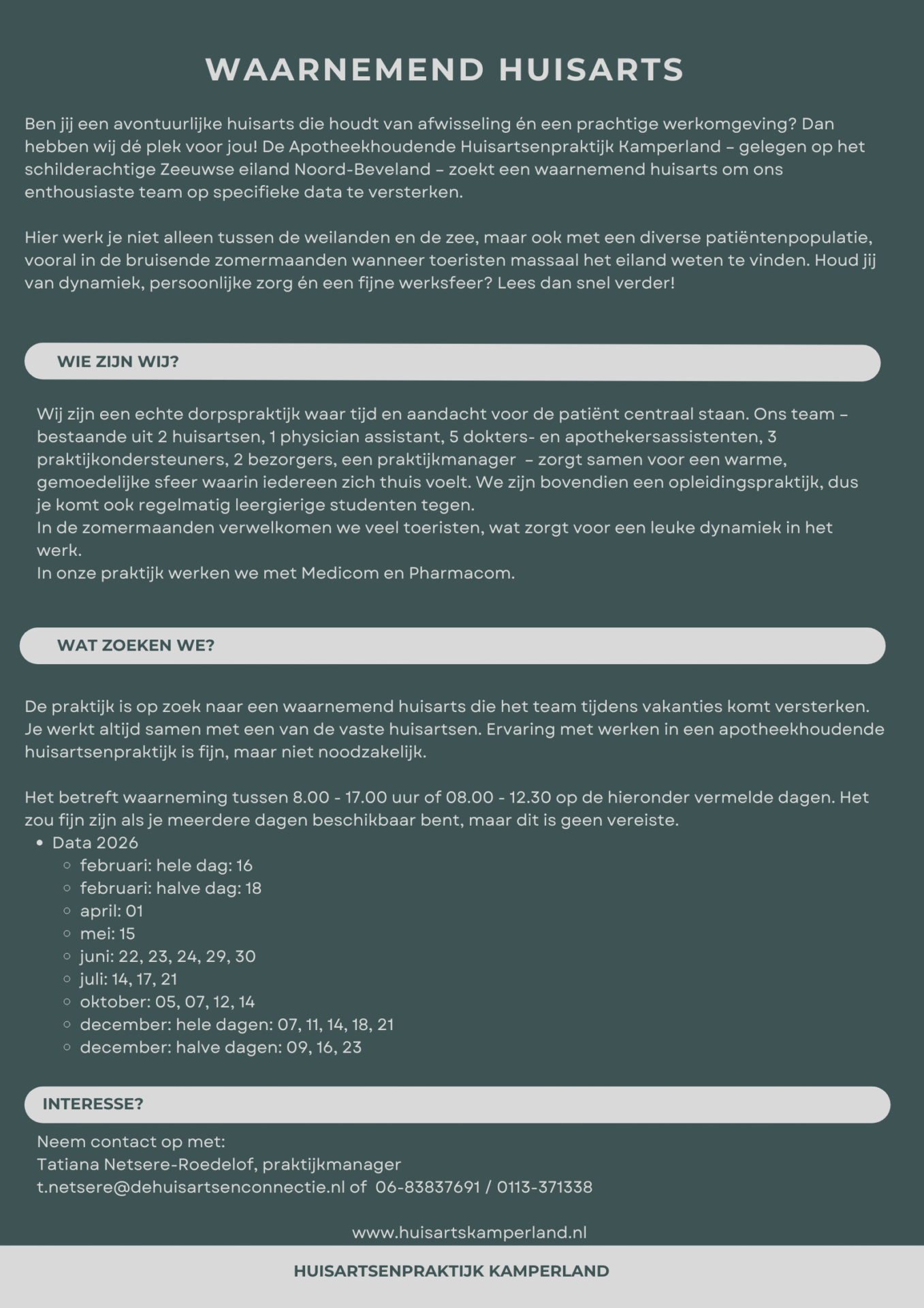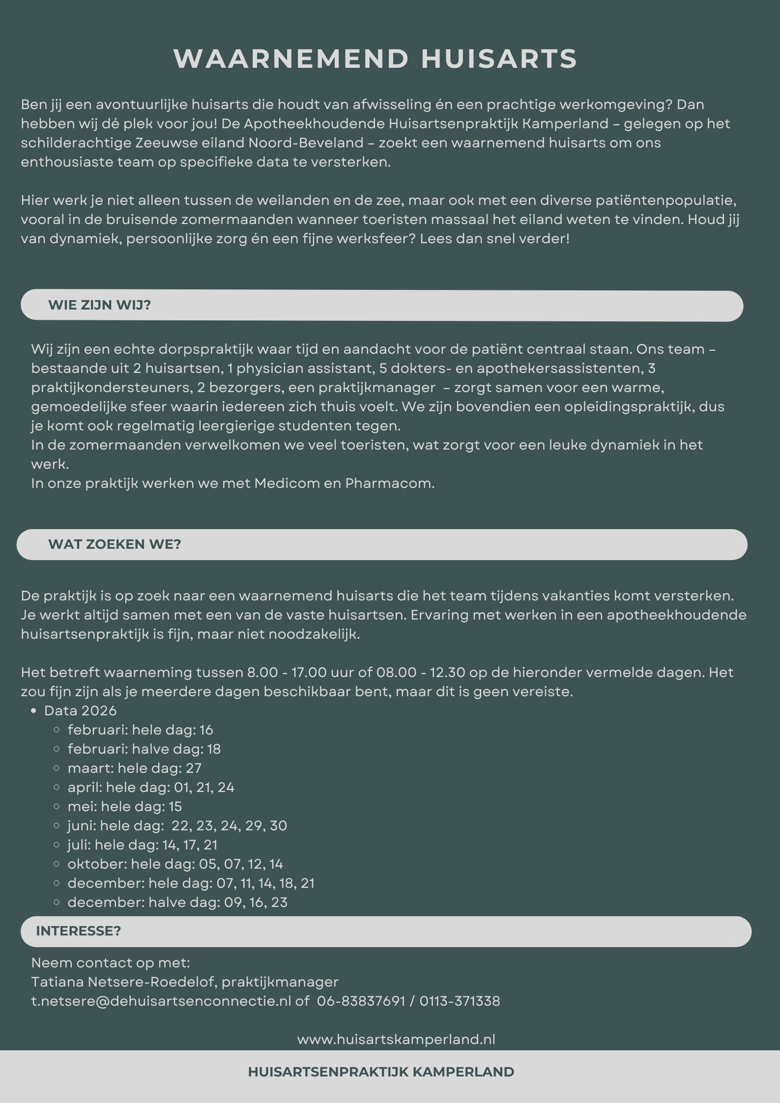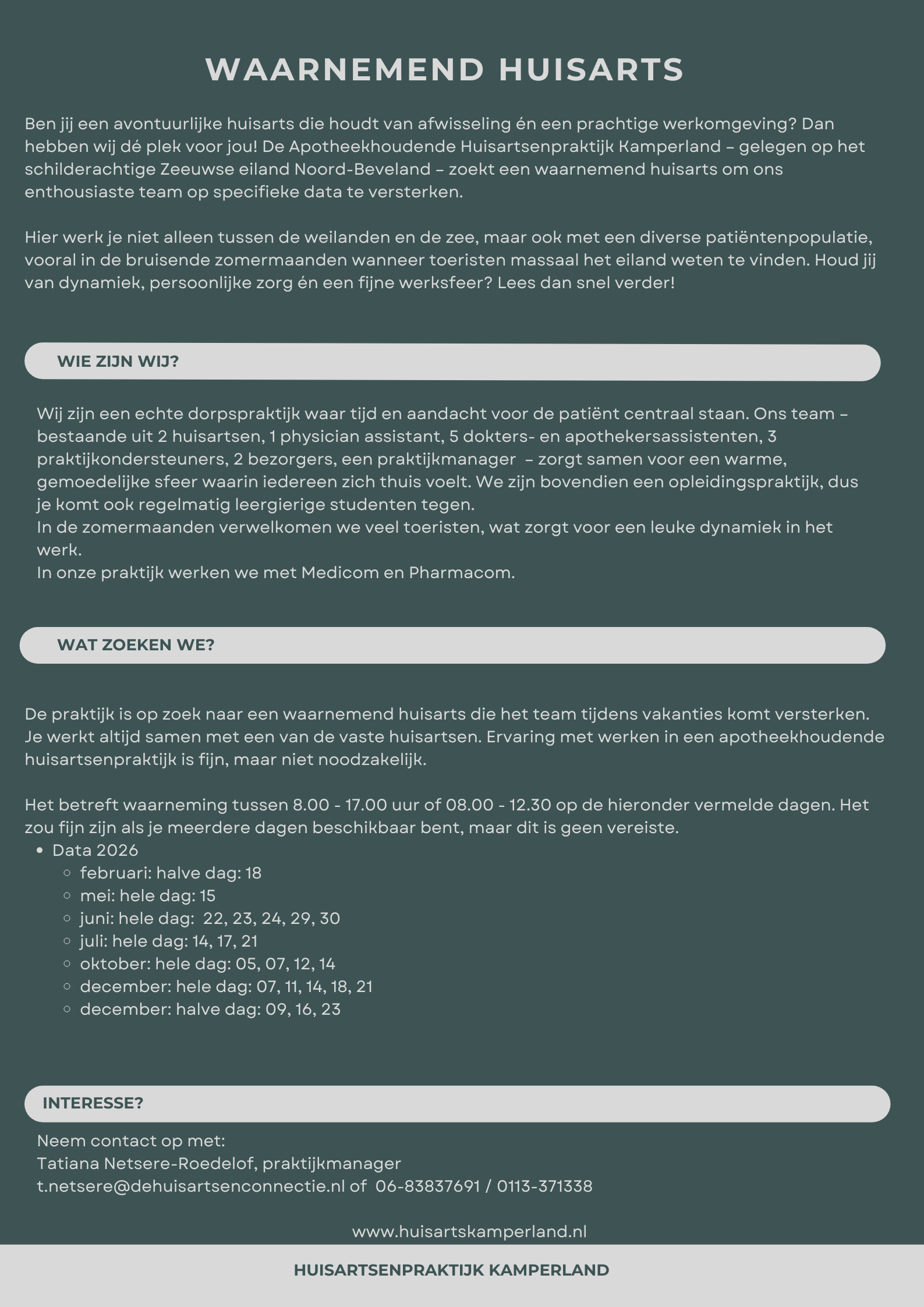 Wij zijn op zoek naar een waarnemend huisarts tijdens vakantieperiodes.
